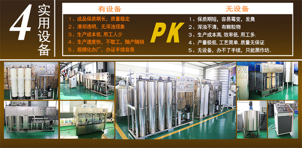 采用流水生產線,從吹瓶到原料調配,自動灌裝,包裝直至出成品,一氣呵成。 設備從大型,中型,小型,設備齊全,滿足不同客戶的辦廠需求.